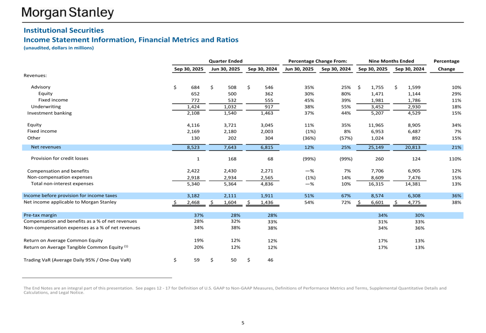The Institutional Securities division, which includes investment banking and trading activities, posted a pre-tax margin of 37% and a return on average common equity of 19%. Investment banking revenues reached $2.11 billion, with underwriting activities contributing $1.42 billion.