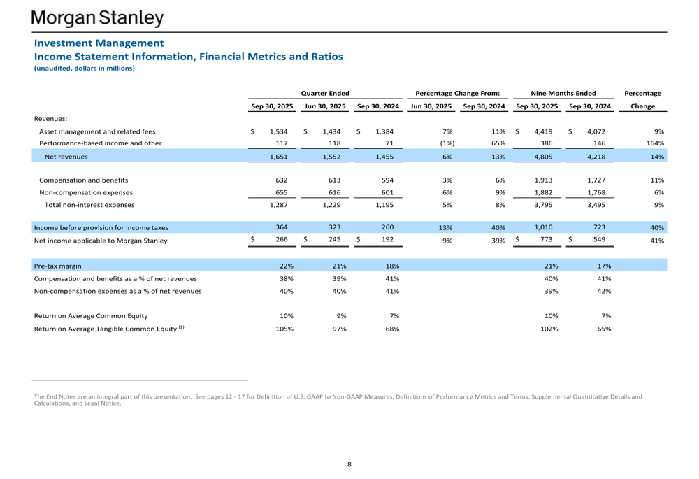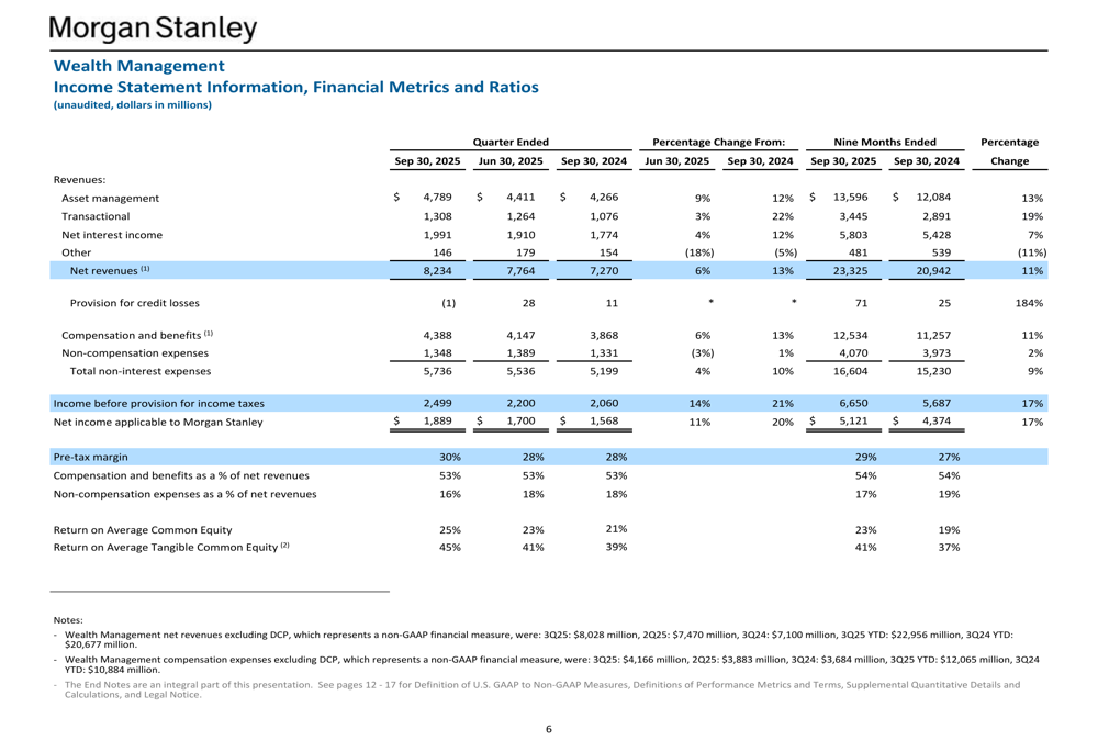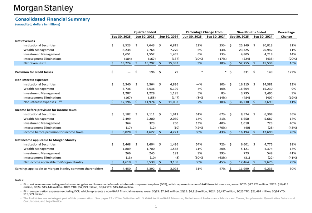 Morgan Stanley reported net revenues of $18.2 billion for Q3 2025, representing an 18% increase compared to the same period last year and a 9% rise from the previous quarter. Net income applicable to Morgan Stanley reached $4.61 billion, surging 45% year-over-year and 30% quarter-over-quarter. Earnings per diluted share came in at $2.80, significantly exceeding analyst expectations of $2.09.