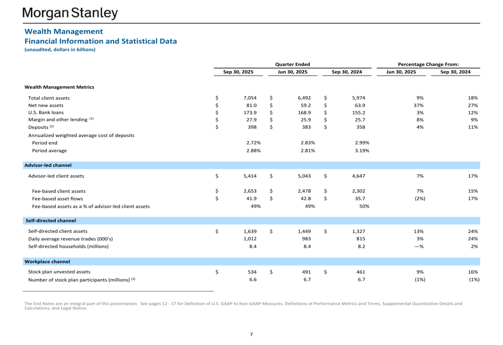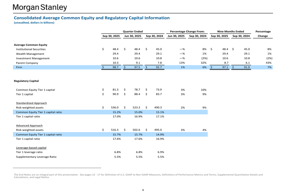Morgan Stanley maintained a strong balance sheet with total assets of $1.36 trillion as of September 30, 2025. The company’s capital position remained robust, with a Common Equity Tier 1 capital ratio of 15.2% under the Standardized Approach and 15.7% under the Advanced Approach, well above regulatory requirements.