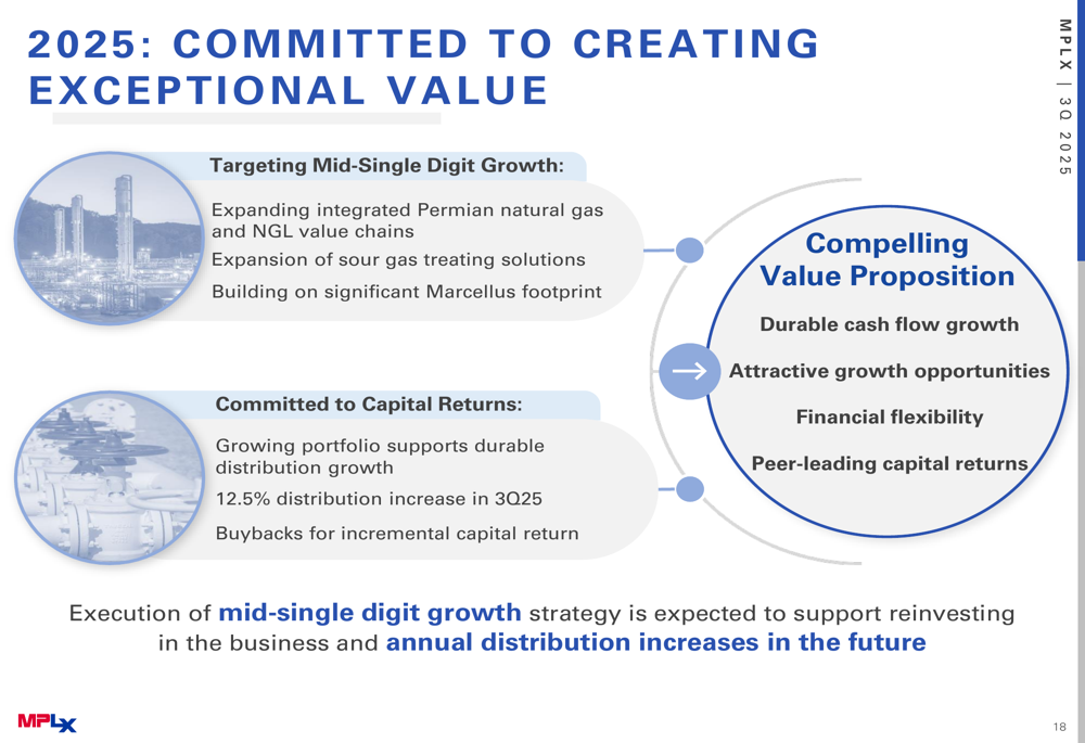 MPLX is targeting mid-single-digit growth going forward, with a focus on expanding its integrated Permian natural gas and NGL value chains, expanding sour gas treating solutions, and building on its significant Marcellus footprint. The company has committed to capital returns through distribution growth and unit repurchases.