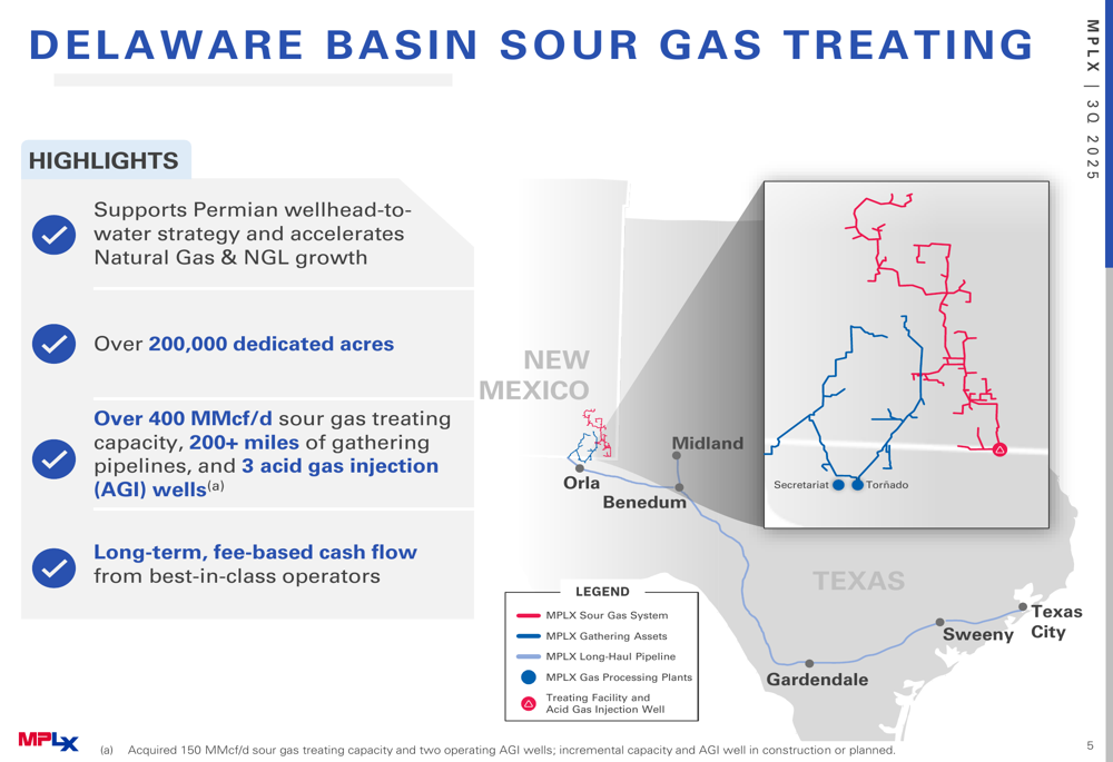 The acquisition includes over 200,000 dedicated acres, more than 400 MMcf/d of sour gas treating capacity, 200+ miles of gathering pipelines, and three acid gas injection wells. This infrastructure supports MPLX's integrated value chain in the Permian Basin, where natural gas production is expected to grow approximately 40% through 2030.