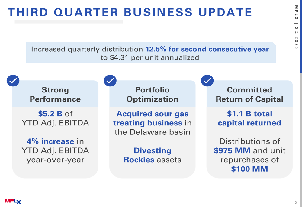 As shown in the following quarterly business update, MPLX increased its quarterly distribution to $4.31 per unit annualized and returned $1.1 billion to unitholders through distributions and unit repurchases: