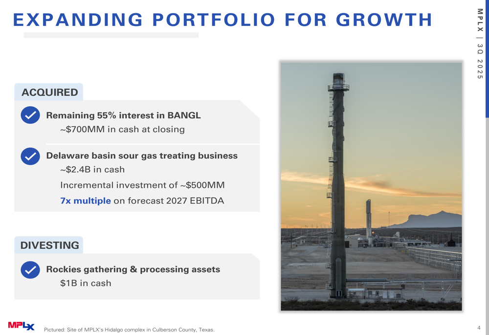 MPLX's most significant strategic move during the quarter was its continued expansion in the Permian Basin, particularly through the acquisition of a Delaware Basin sour gas treating business for approximately $2.4 billion, with plans for an additional $500 million investment. This acquisition aligns with the company's "wellhead-to-water" strategy in the Permian region.