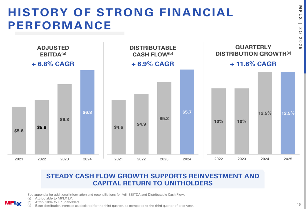 From a financial perspective, MPLX has demonstrated consistent growth over multiple years. The company's adjusted EBITDA has grown at a 6.8% CAGR from 2021 to 2024, while distributable cash flow has increased at a 6.9% CAGR during the same period. Quarterly distributions have grown at an impressive 11.6% CAGR from 2022 to 2025.