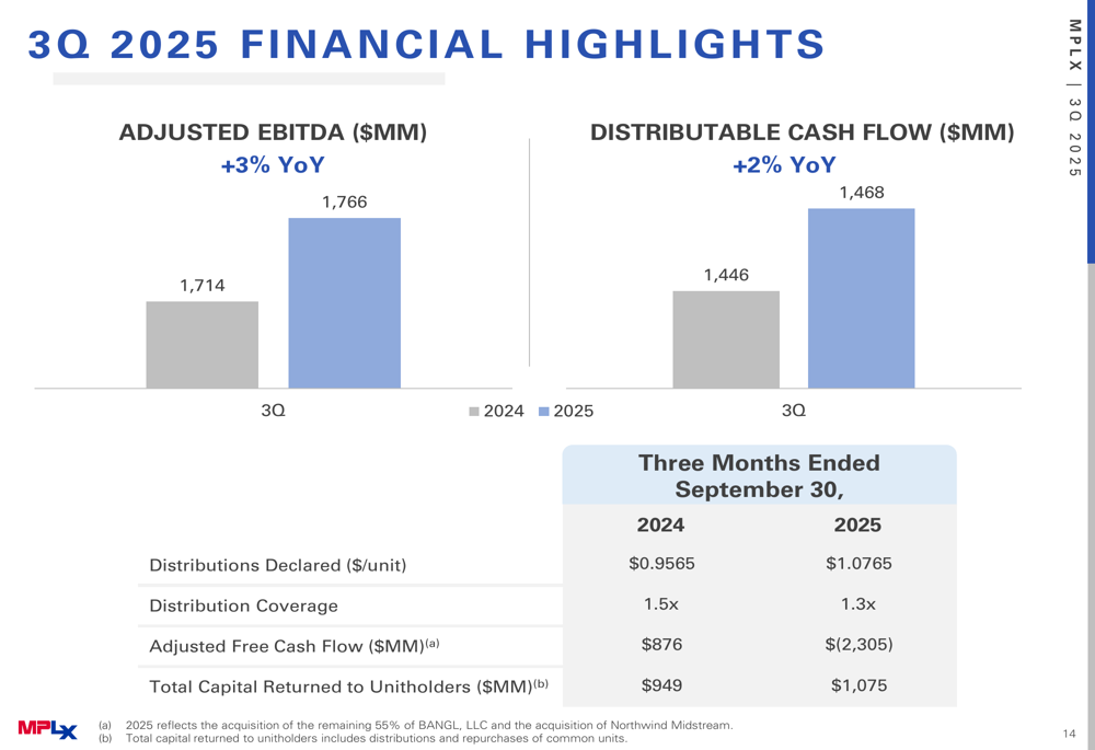 The company's adjusted free cash flow turned negative in Q3 2025 at -$2.31 billion, compared to positive $876 million in Q3 2024, reflecting the substantial capital deployed for acquisitions. Despite this, MPLX maintained a distribution coverage ratio of 1.3x, though this was down from 1.5x in the prior year period.