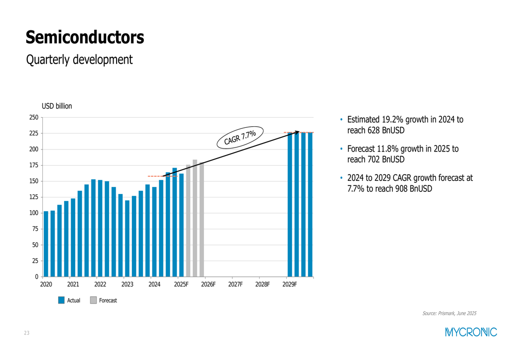 The company operates in markets with varying growth prospects. The semiconductor industry is forecast to grow 11.8% in 2025 to reach USD 702 billion, while the global electronics industry is expected to expand 7.4% to USD 2,743 billion: