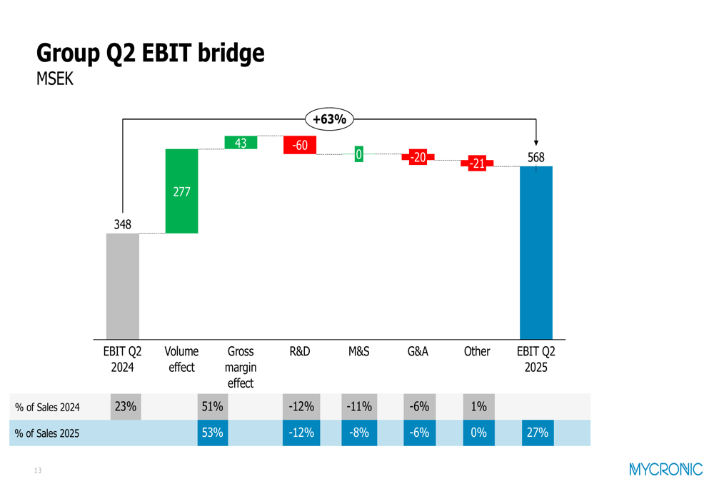 Mycronic’s EBIT growth was primarily driven by volume effects and improved gross margins. As illustrated in this EBIT bridge, volume contributed SEK 277 million and gross margin improvements added SEK 43 million, partially offset by increased R&D and G&A expenses: