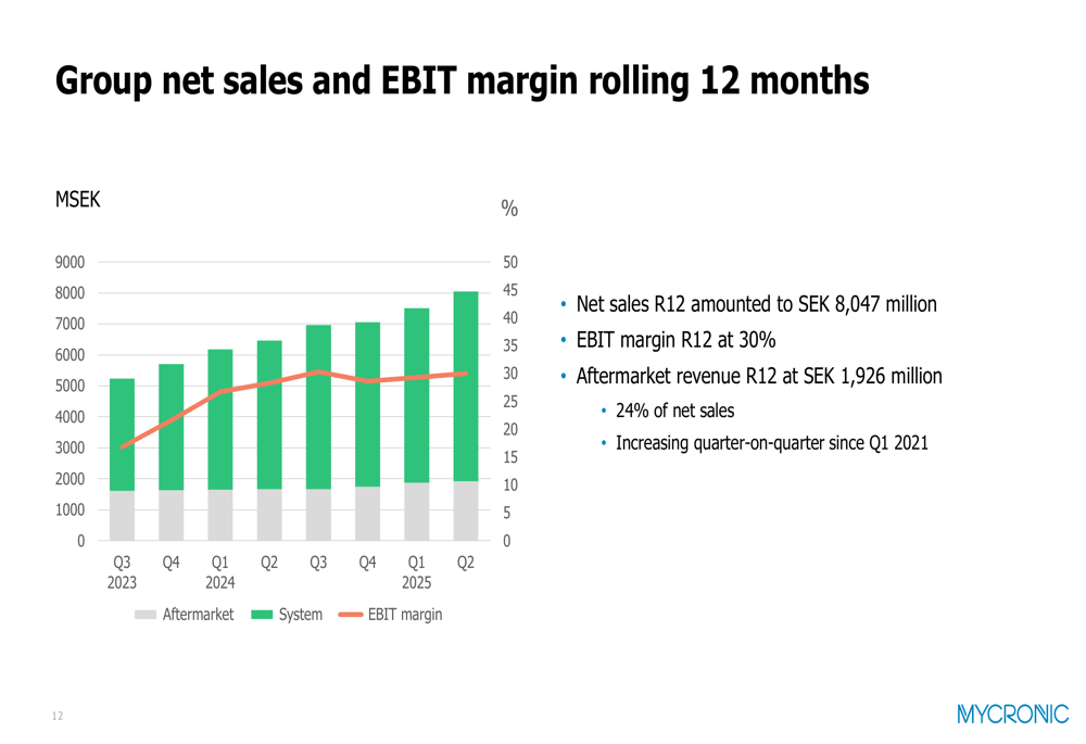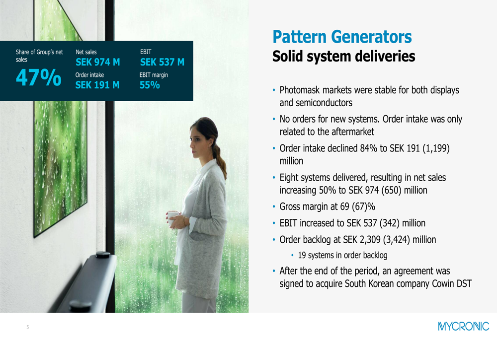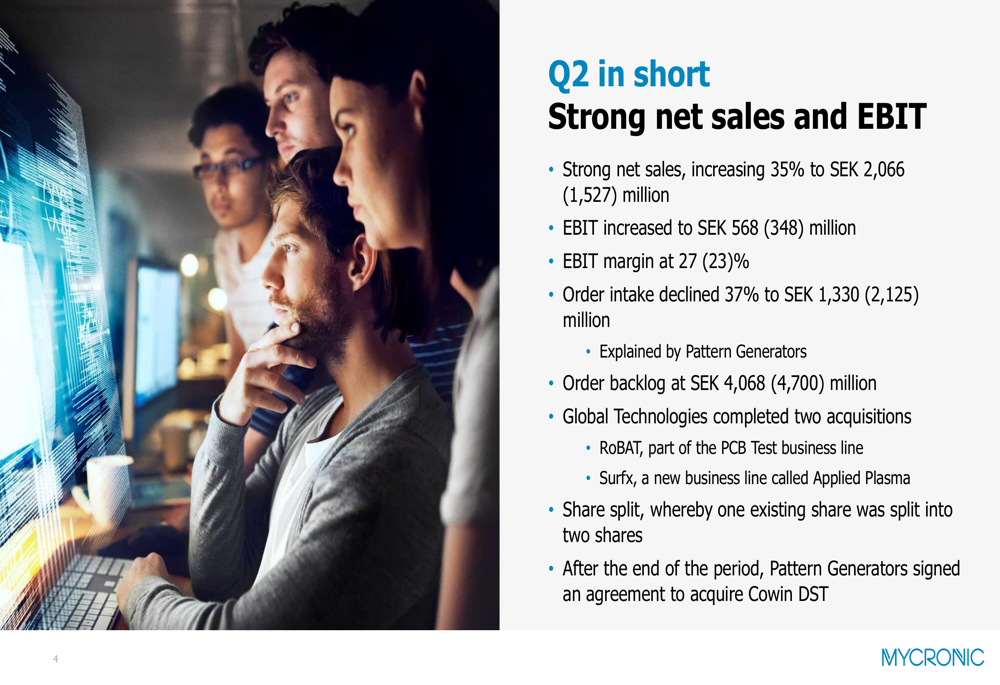 Mycronic completed two strategic acquisitions during the quarter through its Global Technologies division: ROBAT, which has developed technology for fast signal quality tests on PCBs, and Surfx, which provides atmospheric plasma solutions. After the quarter ended, the Pattern Generators division signed an agreement to acquire South Korean company Cowin DST, further strengthening its market position.