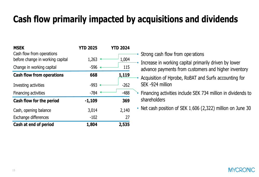 Cash flow from operations remained strong at SEK 668 million for the first half of 2025, though down from SEK 1,119 million in the comparable period. The decline was primarily due to changes in working capital and significant cash outflows for acquisitions totaling SEK 924 million: