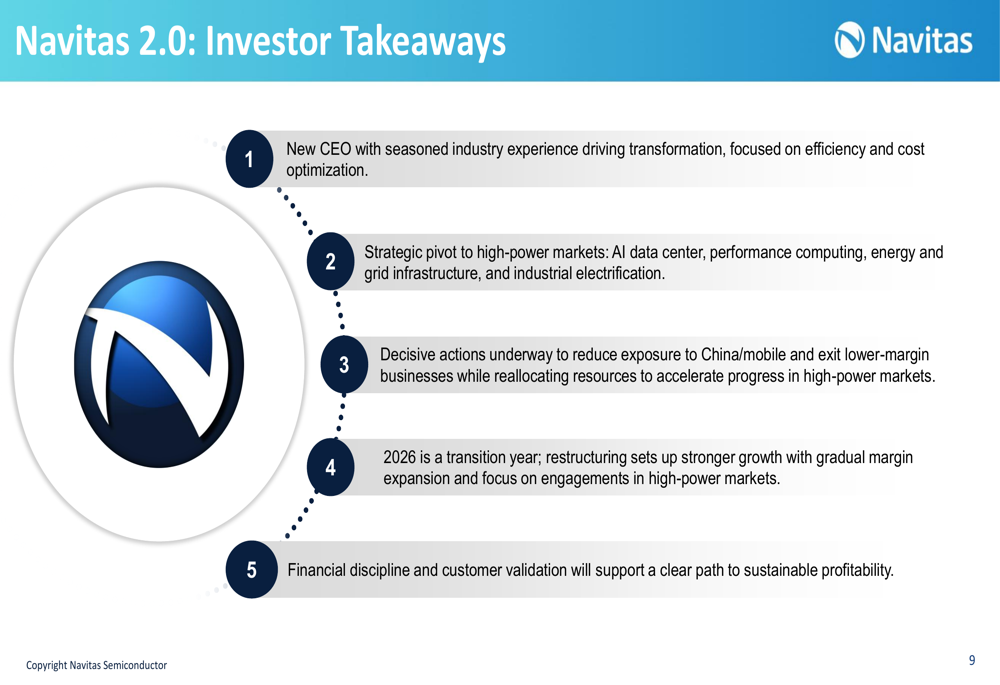 The presentation, led by CEO Chris Allexandre, outlined a comprehensive transformation strategy dubbed "Navitas 2.0," focusing on high-growth markets including AI data centers and energy infrastructure while reducing exposure to mobile and consumer segments.