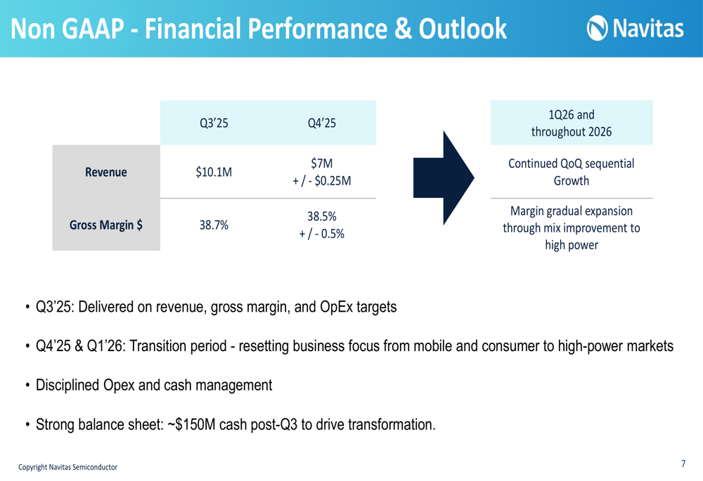 For Q4 2025, Navitas projects revenue of $7 million ± $250,000 with a gross margin of 38.5% ± 0.5%. Management characterized this as a reset quarter, positioning the company for sequential growth beginning in Q1 2026 and continuing throughout the year.