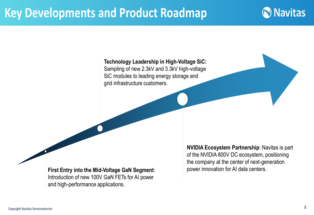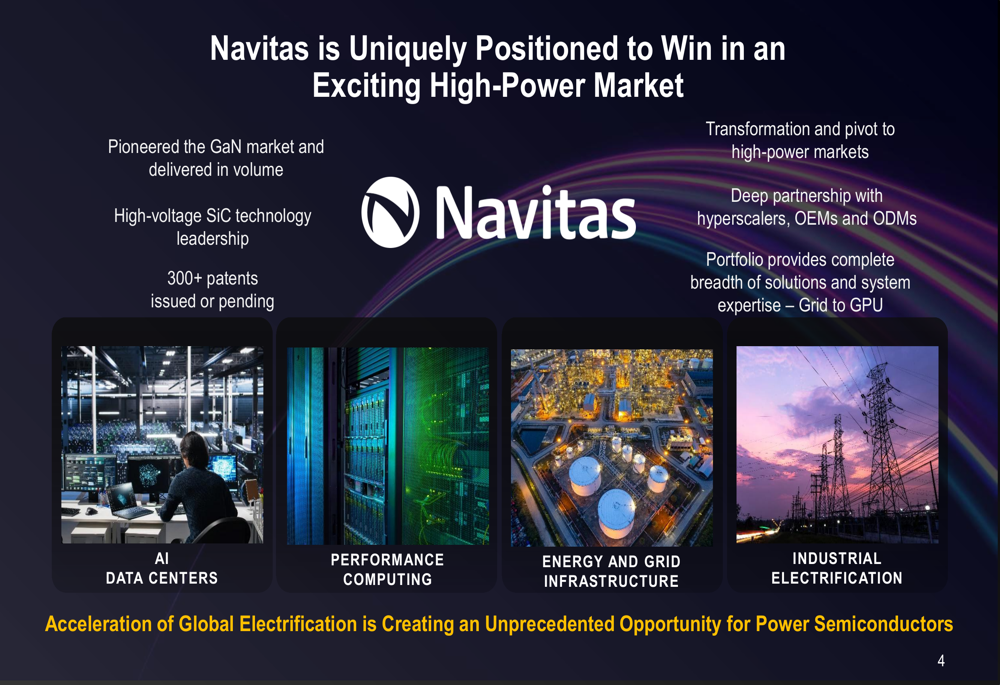 Navitas emphasized its unique position in the high-power semiconductor market, highlighting its pioneering role in GaN technology, SiC leadership, and extensive patent portfolio. The company is leveraging deep partnerships with hyperscalers and OEMs to deliver complete solutions with system expertise.