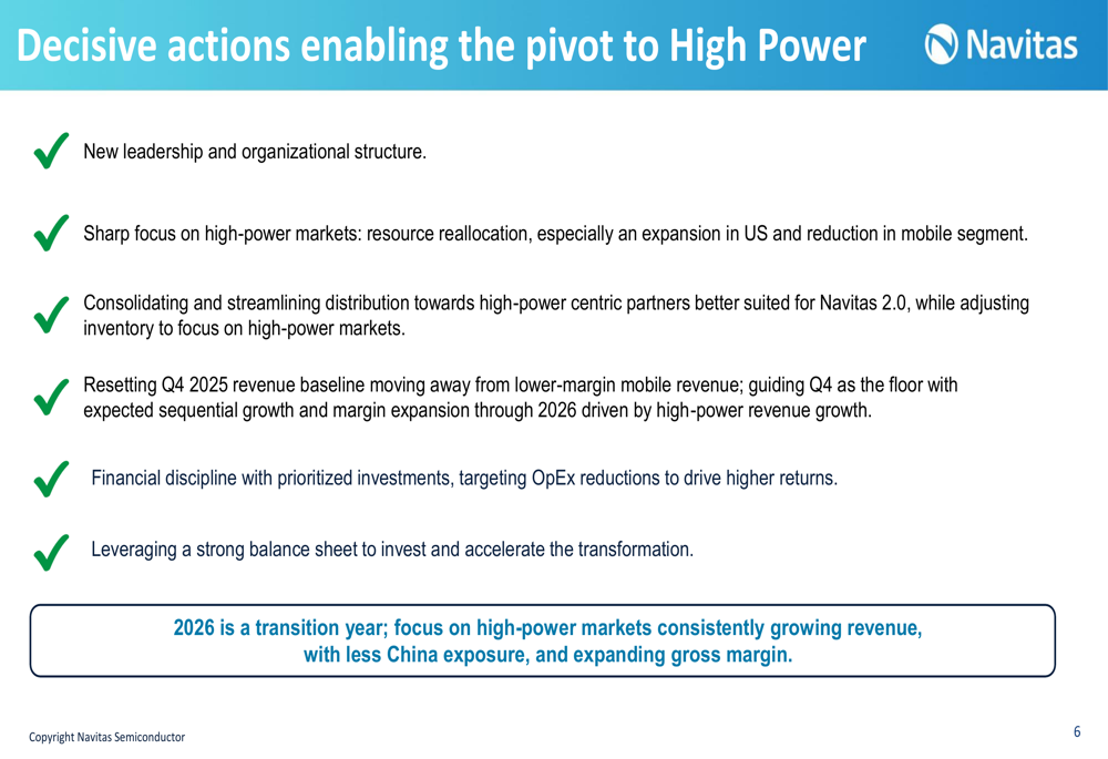 Navitas outlined decisive actions to enable its pivot to high-power markets, including new leadership, resource reallocation, consolidation of distribution partners, and enhanced financial discipline. The company is expanding its U.S. presence while reducing its footprint in the mobile segment and China market.