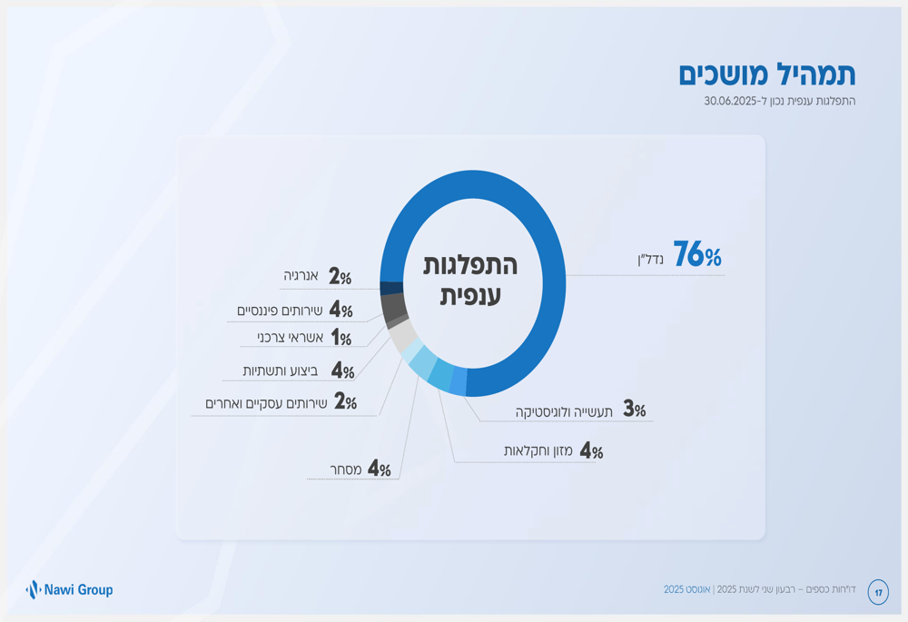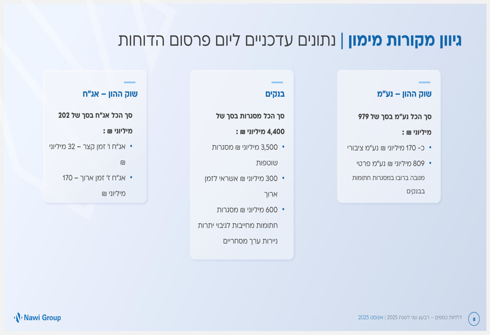 This strategy is supported by a diversified funding structure that includes ₪4.4 billion from banks, ₪979 million from capital markets (NY"M), and ₪202 million from capital markets (Agach).