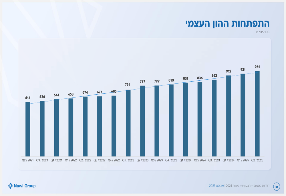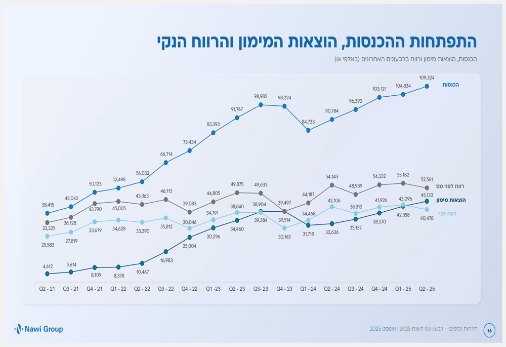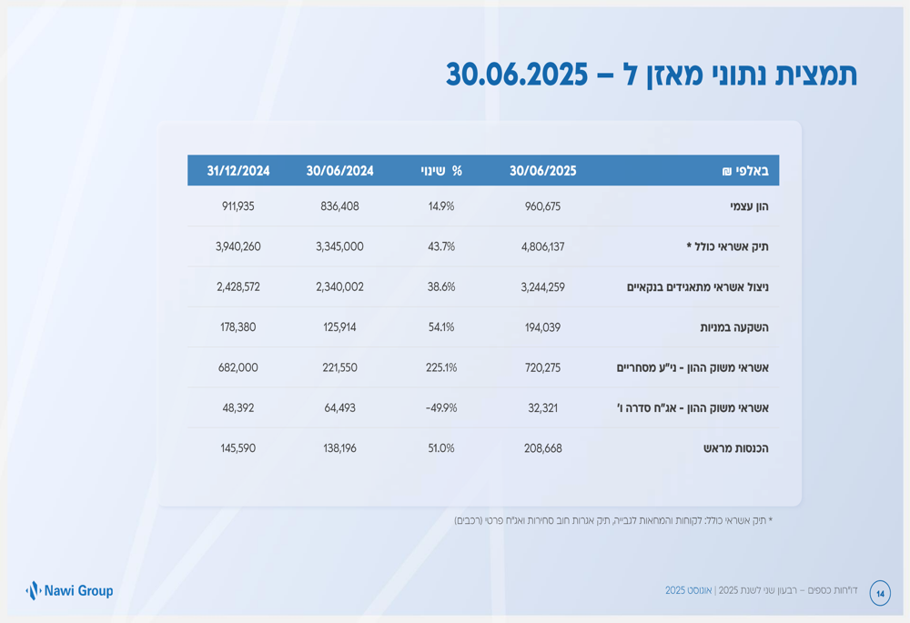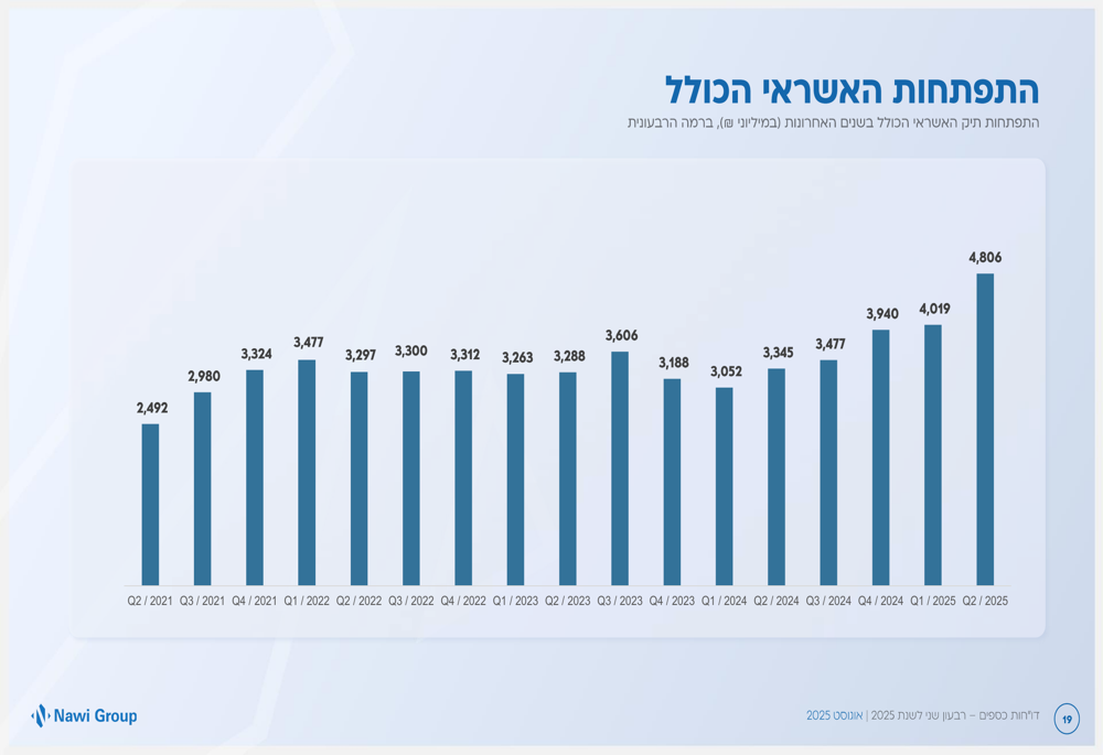 Nawi Group’s credit portfolio has shown consistent growth over the past four years, nearly doubling from ₪2.49 billion in Q2 2021 to ₪4.81 billion in Q2 2025. This expansion reflects the company’s successful execution of its growth strategy in the non-bank financing sector.