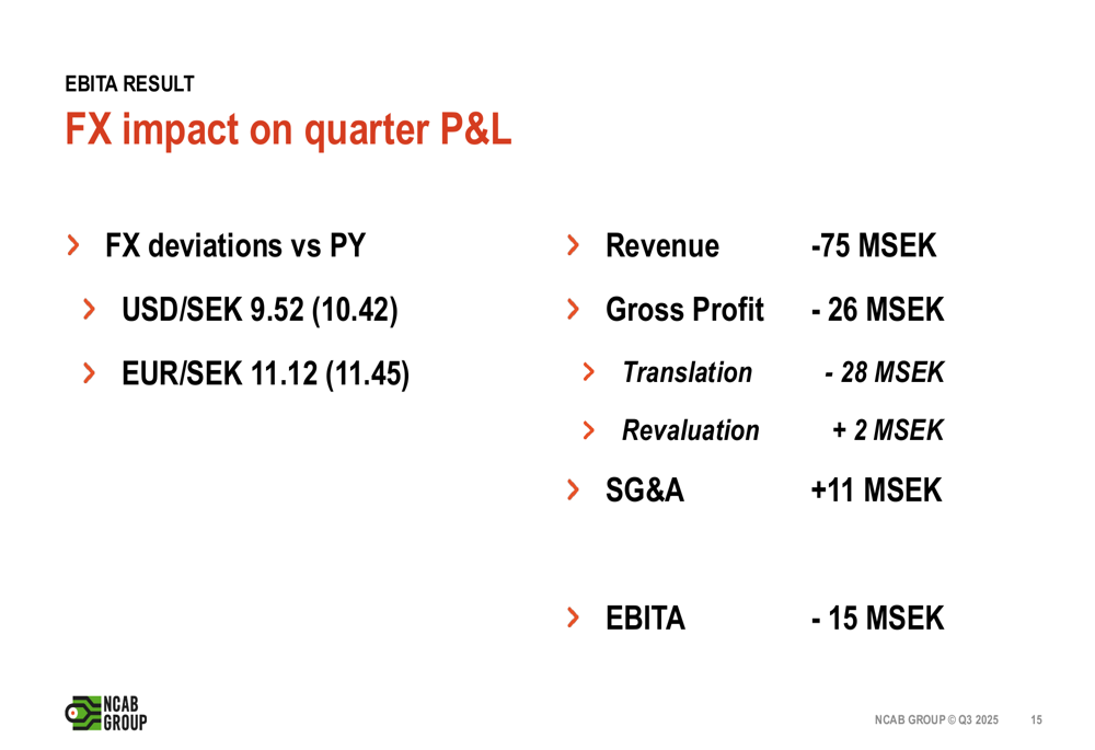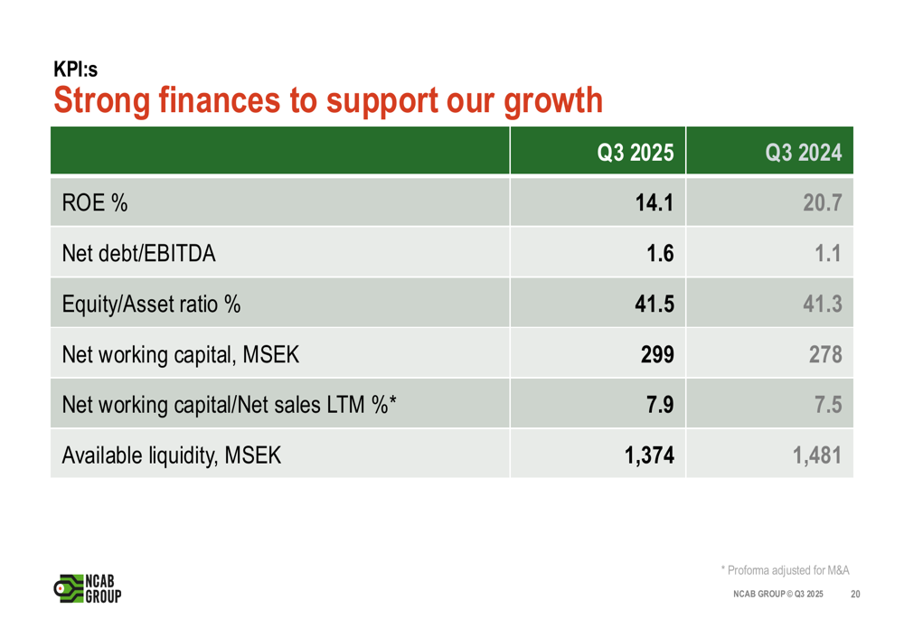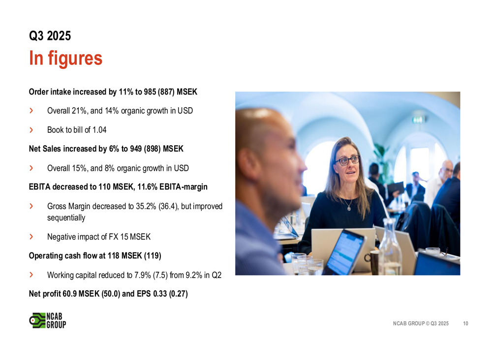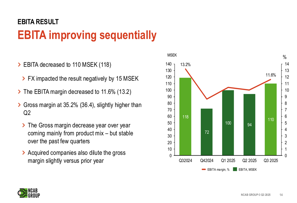 NCAB’s gross margin decreased to 35.2% from 36.4% in Q3 2024, though it showed slight improvement compared to Q2 2025. The company’s net profit reached 60.9 MSEK, with earnings per share of 0.33 SEK, representing a 22% increase year-over-year according to the earnings report.