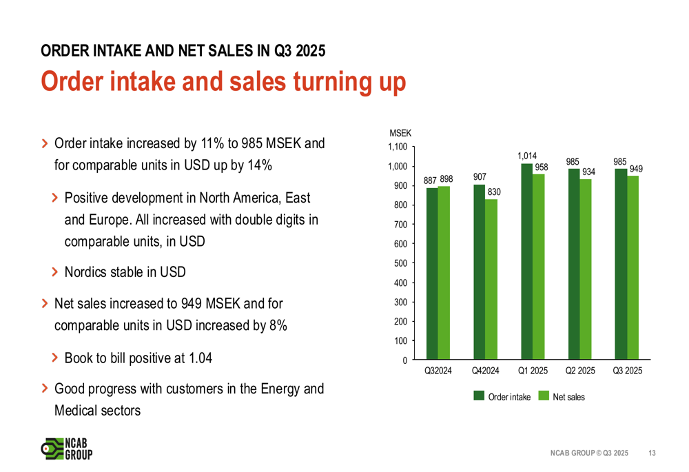 NCAB reported a 6% increase in net sales to 949 MSEK for Q3 2025, while order intake grew by 11% to 985 MSEK. The book-to-bill ratio of 1.04 indicates potential for continued growth in the coming quarters. However, EBITA decreased to 110 MSEK with an 11.6% margin, down from 13.2% in the comparable period.