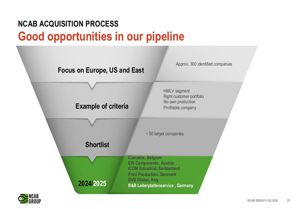 NCAB maintains an active acquisition strategy, with approximately 300 identified target companies and a shortlist of around 50 candidates. This approach aligns with the company’s growth strategy of geographical expansion and market consolidation.