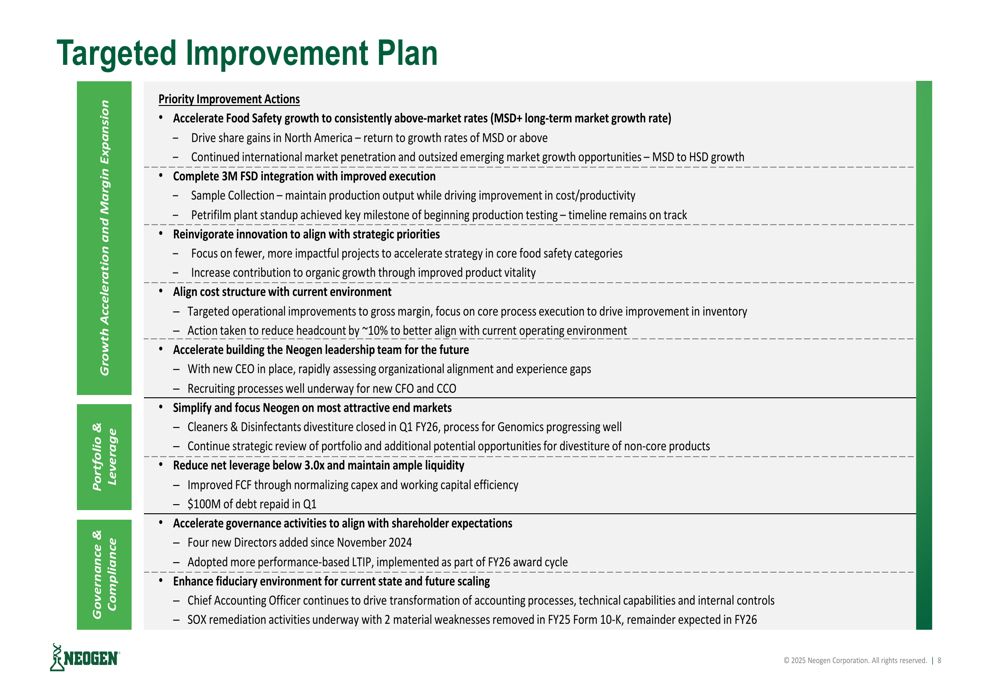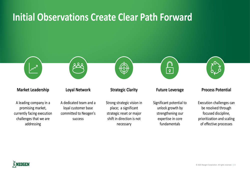 Management highlighted their initial observations about the company’s position, noting that while Neogen faces execution challenges, it remains a market leader with a loyal customer base and strong strategic vision. The company believes significant growth potential can be unlocked by strengthening core fundamentals and improving execution discipline.