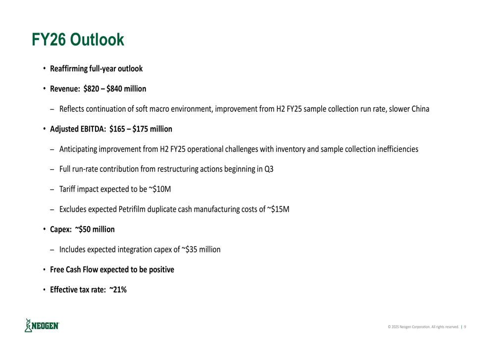 Despite the challenging first quarter results, Neogen reaffirmed its full-year fiscal 2026 outlook, projecting revenue between $820-$840 million and adjusted EBITDA of $165-$175 million. Capital expenditures are expected to be approximately $50 million, with free cash flow projected to be positive. The company anticipates an effective tax rate of approximately 21%.