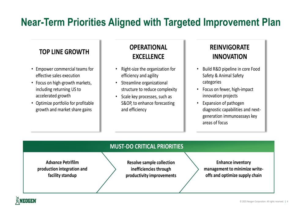 Neogen outlined a comprehensive set of near-term priorities aimed at addressing its execution challenges and improving financial performance. The company has implemented a cost-reduction initiative expected to deliver approximately $20 million in annualized savings.