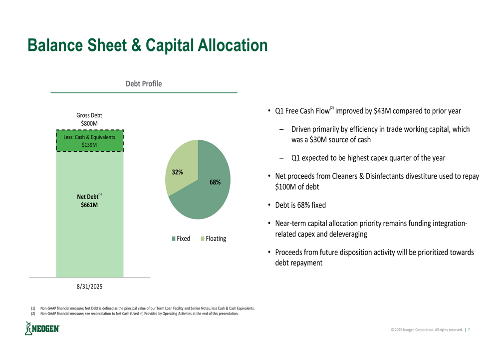 Neogen reported gross debt of $800 million and cash and equivalents of $139 million, resulting in net debt of $661 million. The company’s debt profile is 68% fixed and 32% floating. First quarter free cash flow improved by $43 million compared to the prior year.