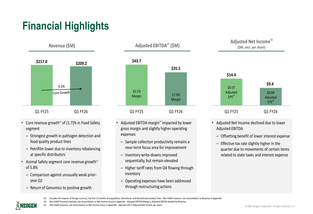 Neogen reported Q1 FY26 revenue of $209.2 million, down from $217.0 million in the same period last year and representing a sequential decline from the $225.5 million reported in Q4 FY25. Adjusted EBITDA fell to $35.5 million from $43.7 million year-over-year, while adjusted net income decreased to $9.4 million ($0.04 per share) from $14.4 million ($0.07 per share).