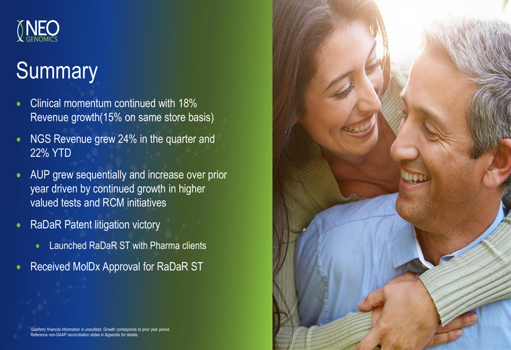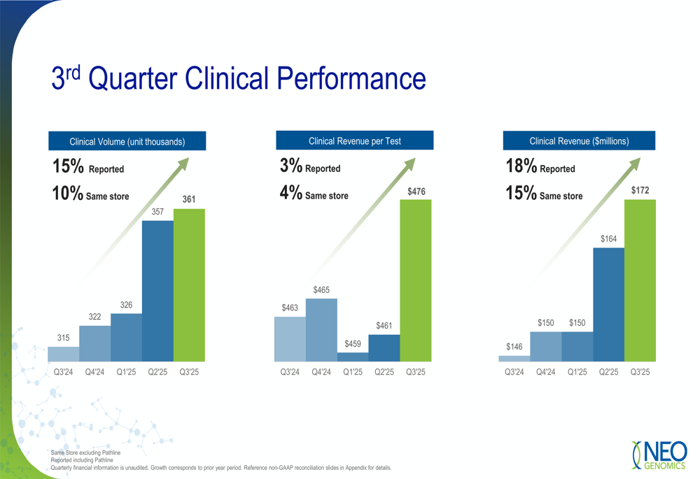 NeoGenomics delivered strong results across its clinical business, with particularly robust growth in next-generation sequencing (NGS) services. The company highlighted three key achievements in its quarterly presentation: strong clinical performance, strategic wins with its RaDaR technology, and acceleration in NGS adoption.