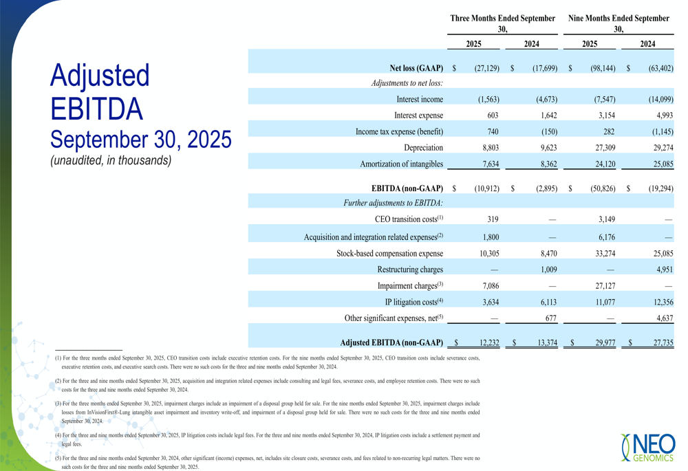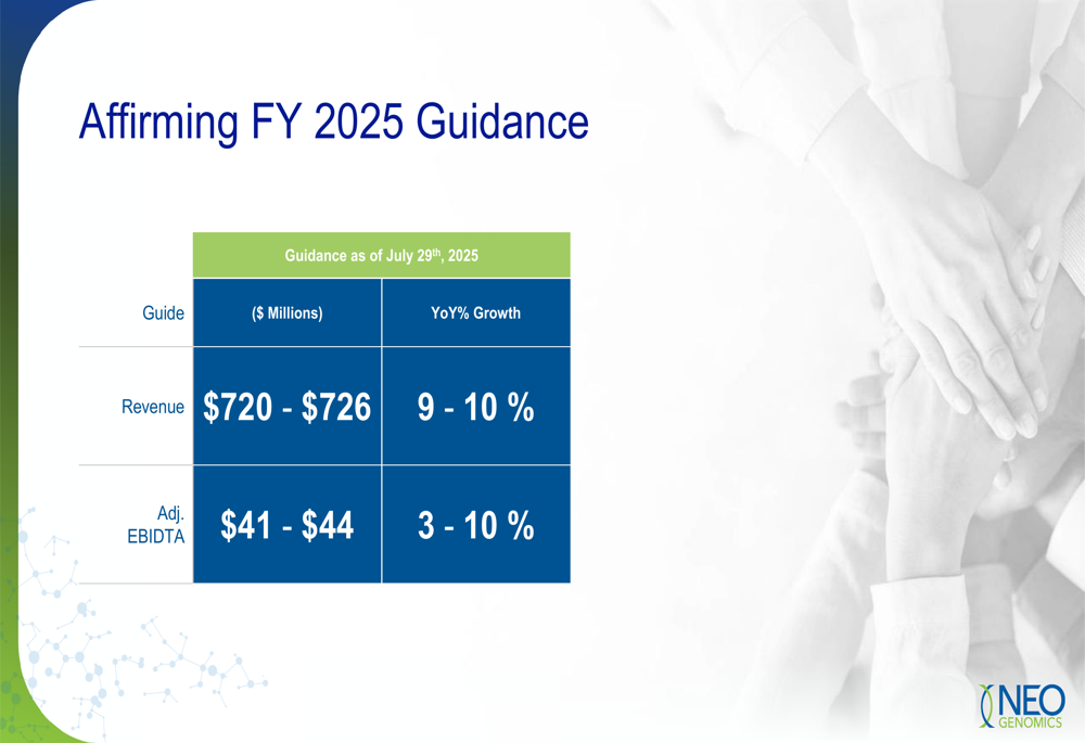 NeoGenomics affirmed its full-year 2025 guidance, projecting revenue between $720 million and $726 million, representing 9-10% year-over-year growth. The company also maintained its adjusted EBITDA guidance of $41-$44 million, representing 3-10% growth.