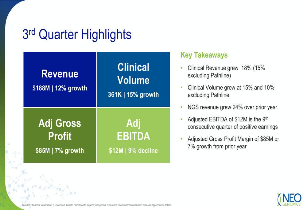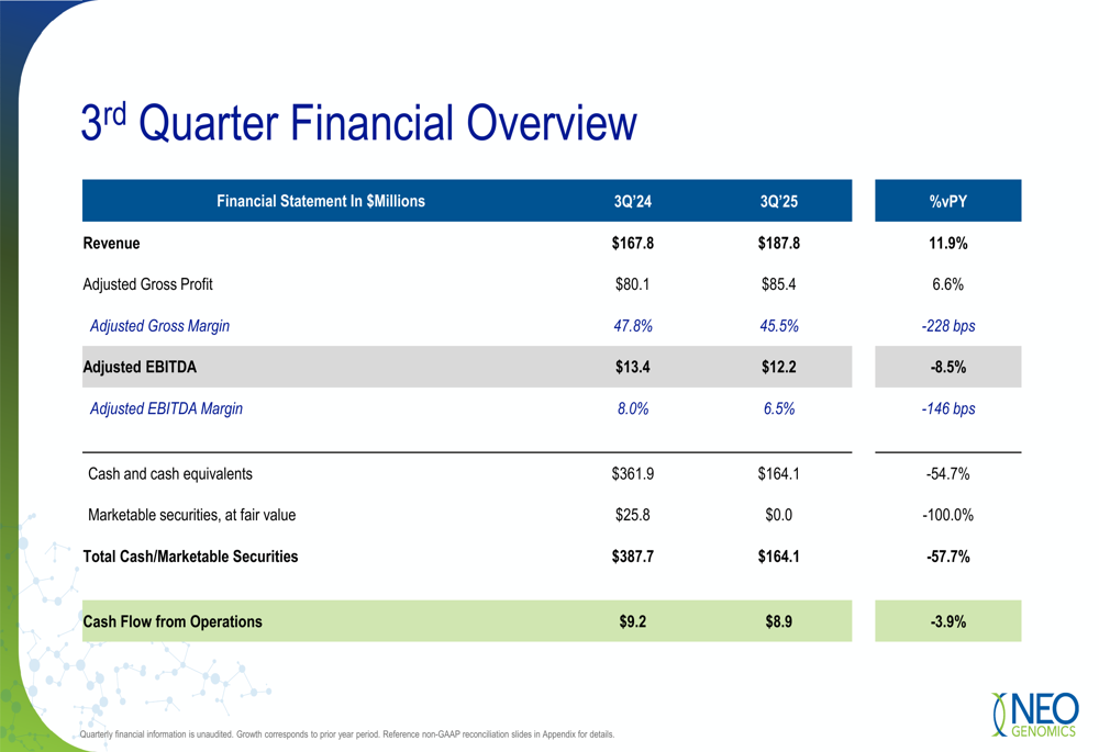 NeoGenomics reported total revenue of $187.8 million for the third quarter, representing an 11.9% increase from $167.8 million in the same period last year. Despite this growth, adjusted EBITDA declined 8.5% to $12.2 million, marking the ninth consecutive quarter of positive earnings but reflecting some margin pressure.