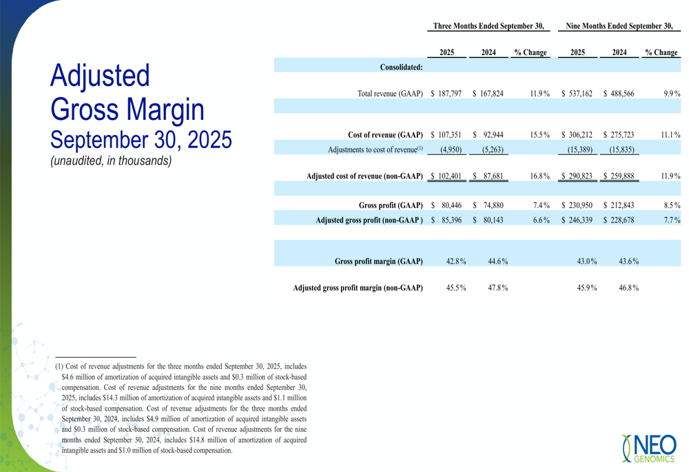 Adjusted gross profit increased 6.6% to $85.4 million, but adjusted gross margin contracted by 228 basis points to 45.5%. Similarly, adjusted EBITDA margin declined by 146 basis points to 6.5%. This suggests that while NeoGenomics is successfully growing its top line, it faces challenges in maintaining profitability margins during its expansion.