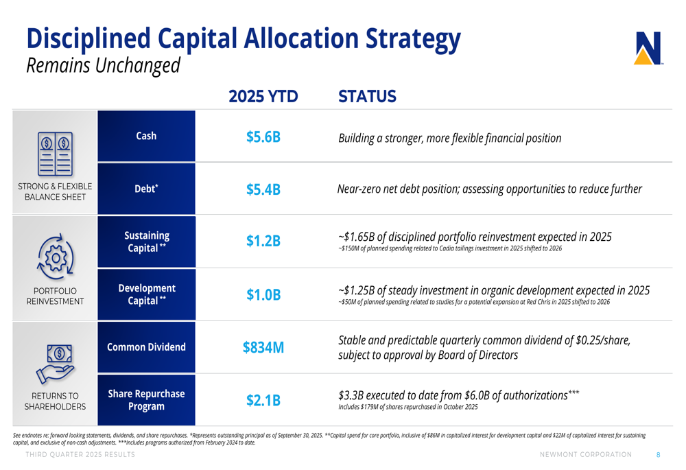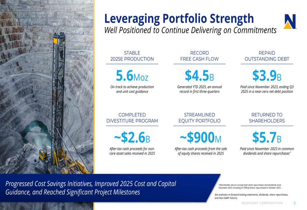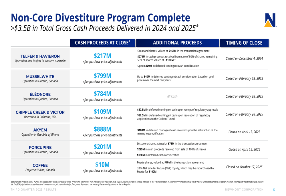 A key achievement highlighted in the presentation was the completion of Newmont’s non-core divestiture program, which delivered over $3.5 billion in total gross cash proceeds during 2024 and 2025. The company received nearly $640 million from asset and equity sales in Q3 alone.