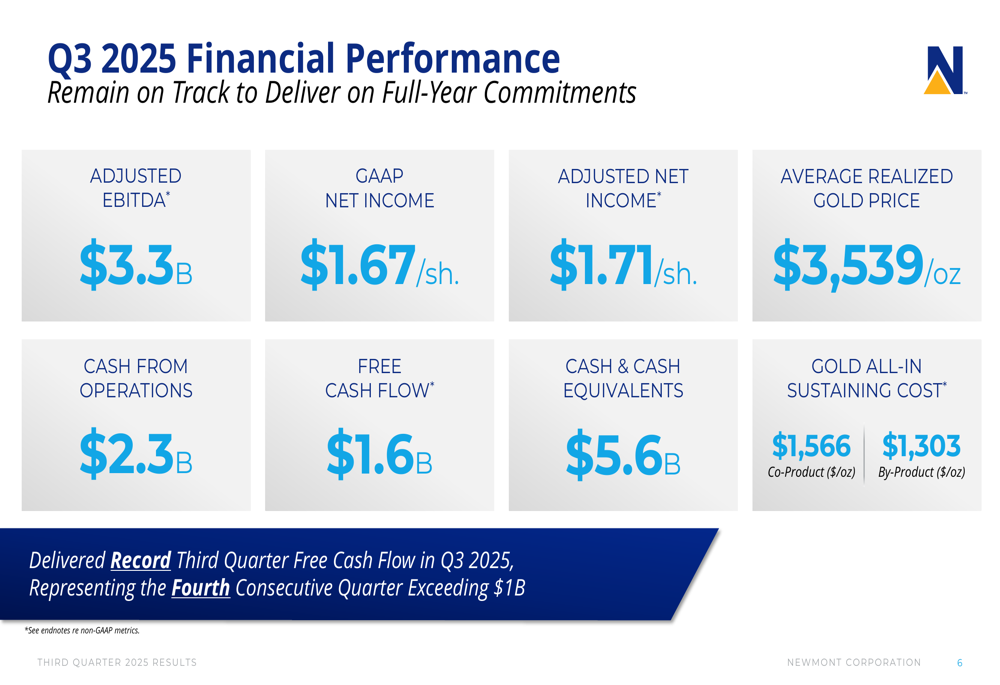 The following slide details Newmont’s Q3 2025 financial performance metrics:
