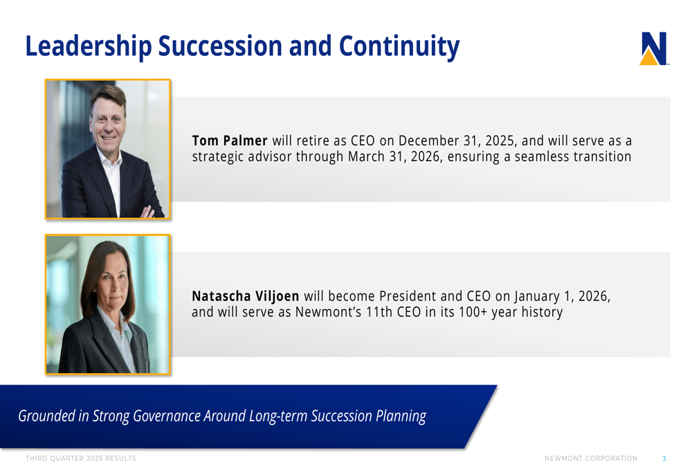 This planned succession demonstrates Newmont’s commitment to strong governance and ensures continuity in leadership as the company continues to execute its strategic initiatives.