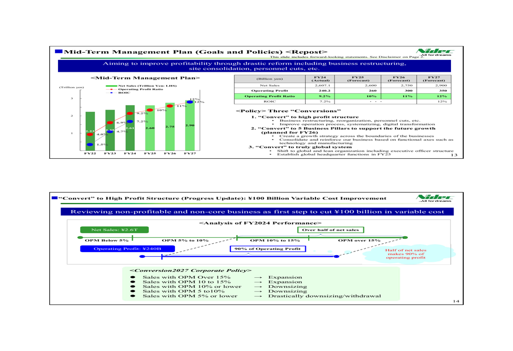 The centerpiece of Nidec’s presentation was the introduction of its new mid-term management plan, "Conversion 2027," which outlines ambitious targets for profitability improvement:
