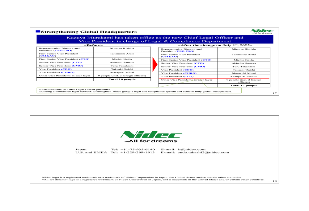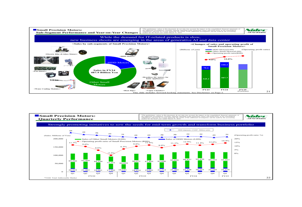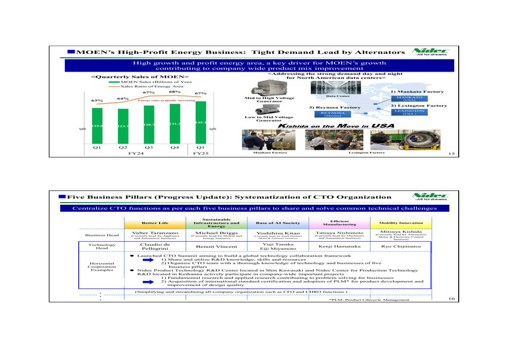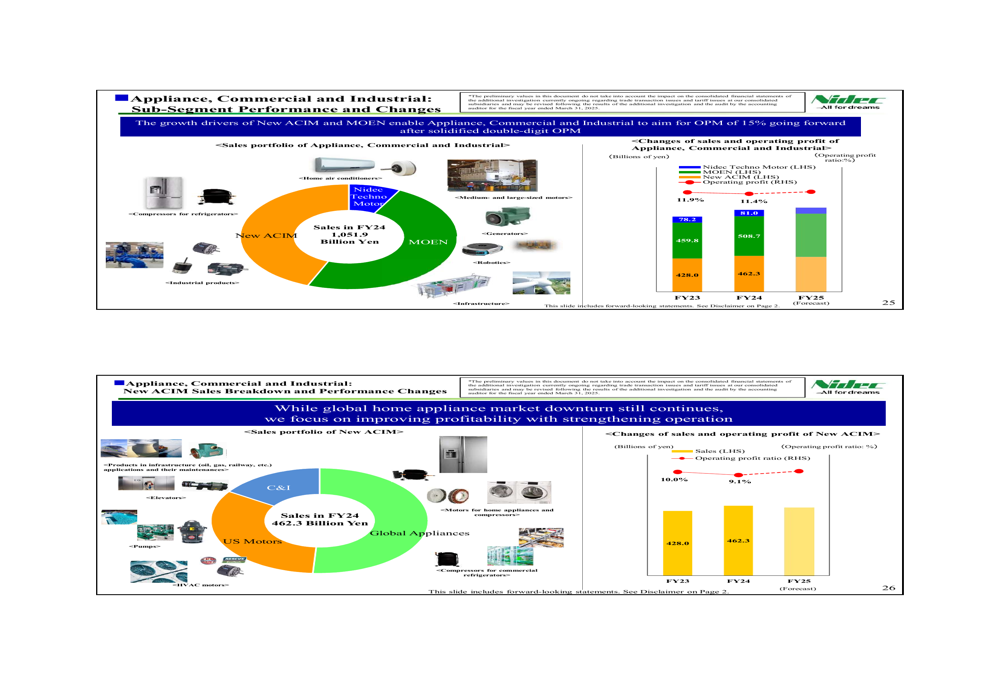 Nidec’s presentation emphasized its commitment to improving profitability through drastic reforms, including business restructuring, site consolidation, and personnel cuts. The company maintained its full-year FY2025 forecast of 2,600 billion yen in net sales, 260 billion yen in operating profit, and 200 billion yen in profit attributable to owners.