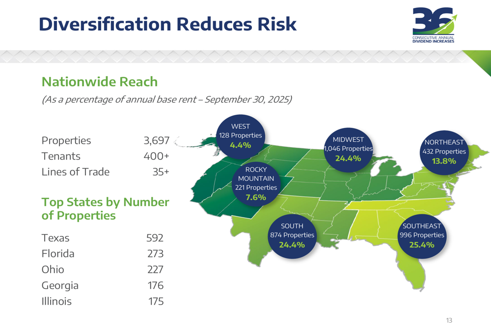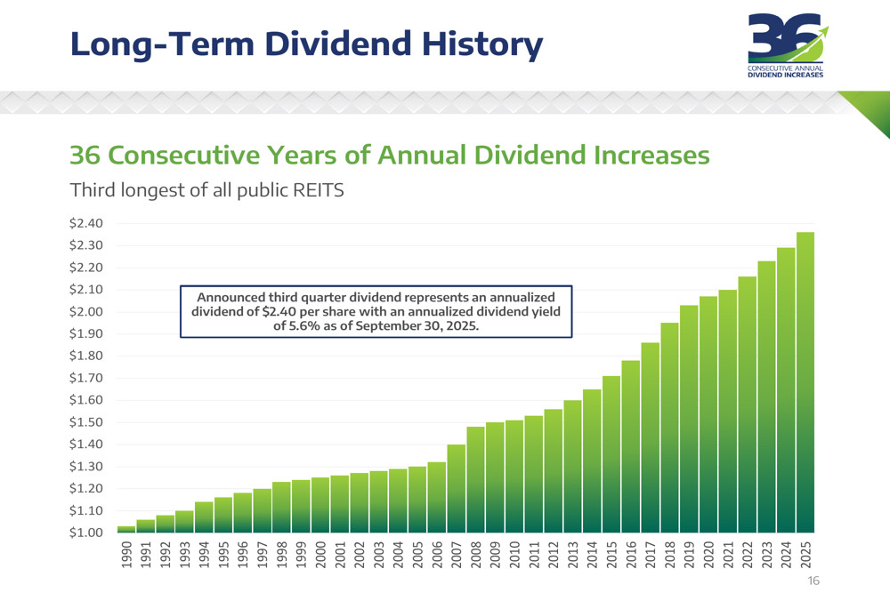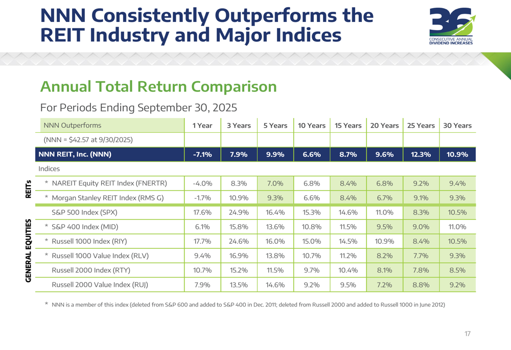 A standout achievement highlighted in NNN’s presentation is its 36-year track record of consecutive annual dividend increases, the third-longest among all public REITs. The company’s most recent quarterly dividend of $0.60 per share represents a 3.4% increase year-over-year and translates to an annualized dividend yield of 5.6% based on the September 30, 2025 stock price.