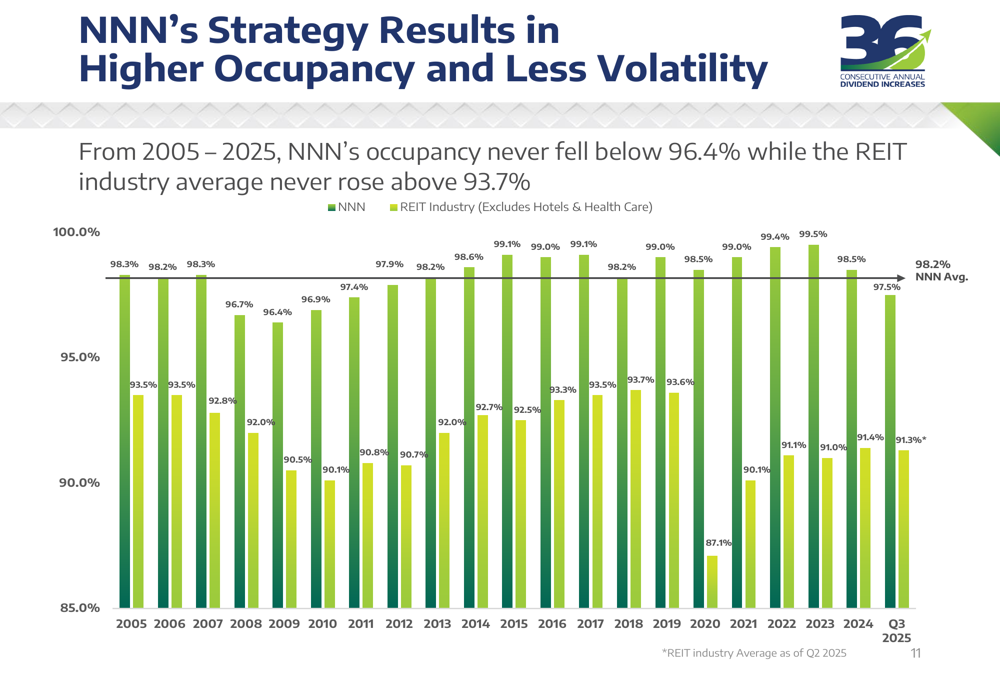 NNN REIT’s presentation emphasized its consistent and simple strategy focused on single-tenant, net-leased properties. This approach has resulted in higher occupancy rates and less volatility compared to industry averages. As of Q3 2025, NNN maintained a 97.5% occupancy rate, significantly outperforming the industry average of 91.4%.