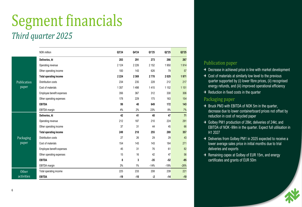 Norske Skog’s segment performance reveals a stark contrast between its traditional publication paper business and the emerging packaging paper segment. The publication paper division delivered 267kt with a positive EBITDA margin of 7%, while the packaging paper segment reported a negative EBITDA margin of -26%, reflecting the temporary profitability impact from the Golbey PM1 ramp-up.