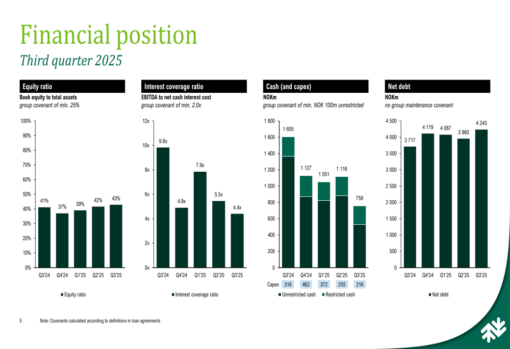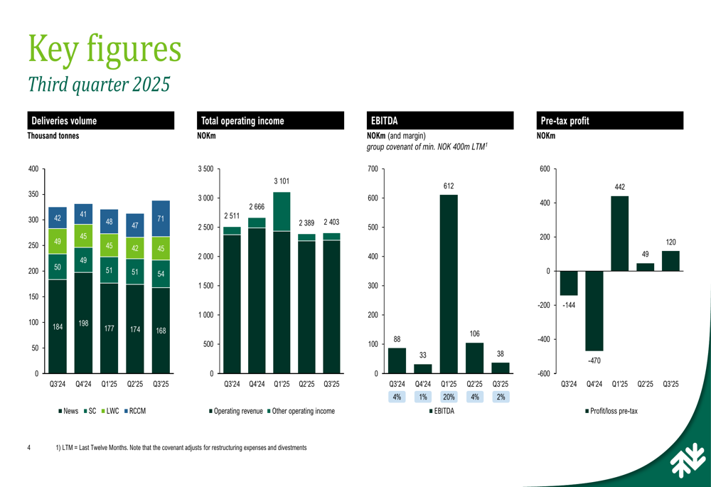 Norske Skog delivered a pre-tax profit of NOK 120 million in Q3 2025, contributing to a year-to-date profit of NOK 610 million. However, EBITDA decreased to NOK 38 million, down from previous quarters. The company maintained a solid equity ratio of 43%, well above its minimum covenant requirement of 25%, while its interest coverage ratio stood at 4.4x, exceeding the minimum covenant of 2.0x.