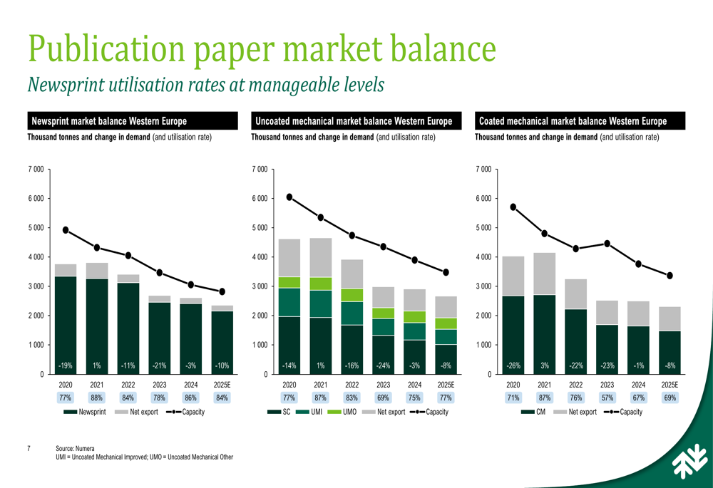 The publication paper market in Western Europe continues to face structural decline, with utilization rates at 84% for newsprint in 2025. Despite this challenging environment, Norske Skog maintains a competitive cost position in the market.