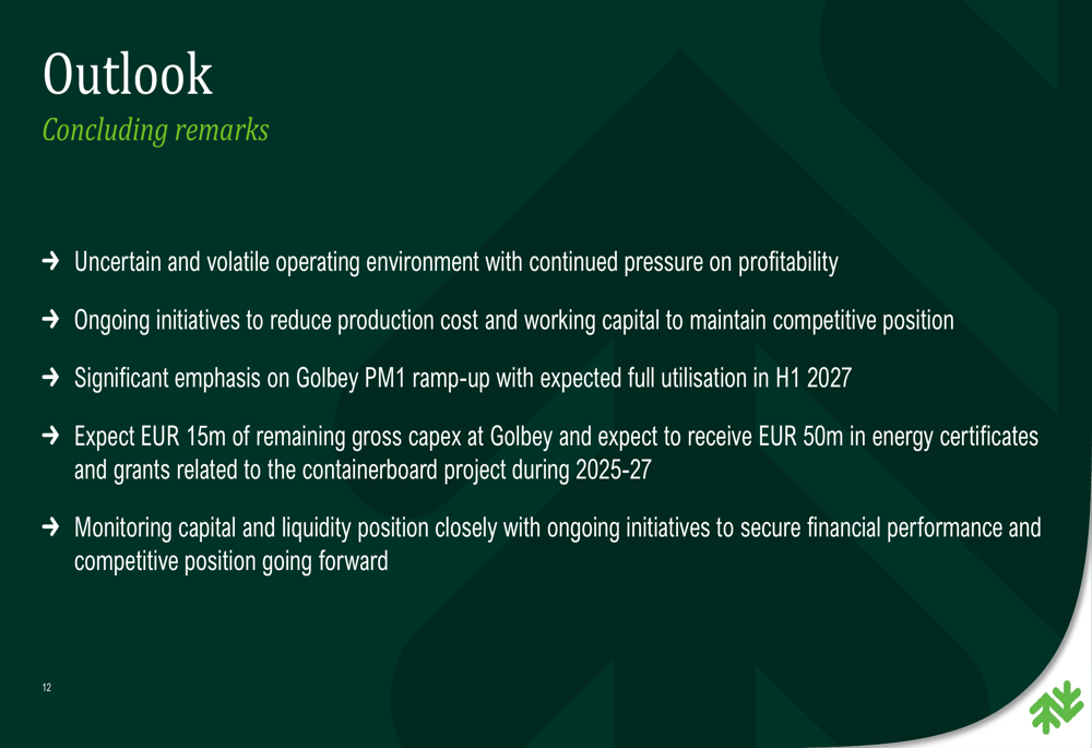 Norske Skog acknowledged the "uncertain and volatile operating environment with continued pressure on profitability" in its outlook. The company is focusing on reducing production costs and working capital to maintain its competitive position while emphasizing the Golbey PM1 ramp-up.
