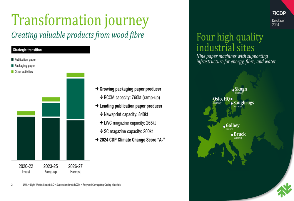 Norske Skog continues its strategic shift from publication paper to packaging paper, with a target of reaching 760kt of recycled containerboard (RCCM) capacity. The company formally took over the containerboard machine PM1 at Golbey during the quarter, producing 28kt and delivering 24kt of packaging paper. Management expects continuous ramp-up toward full utilization during the first half of 2027.