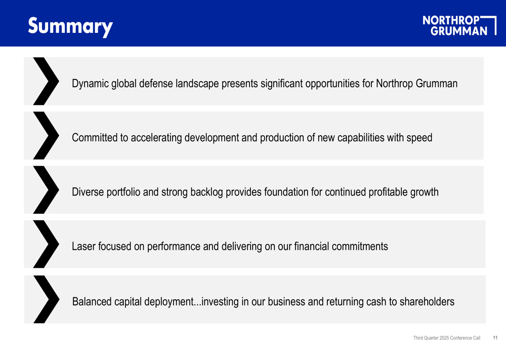 Northrop Grumman emphasized its strategic positioning in a dynamic global defense landscape that presents significant growth opportunities. The company highlighted its commitment to accelerating the development and production of new capabilities, supported by a diverse portfolio and strong backlog.