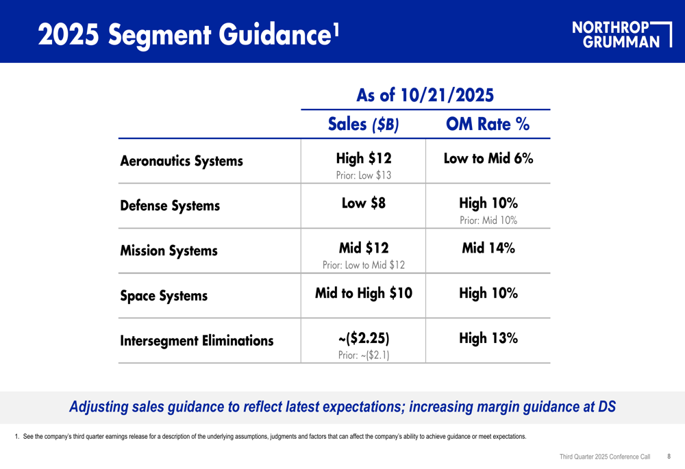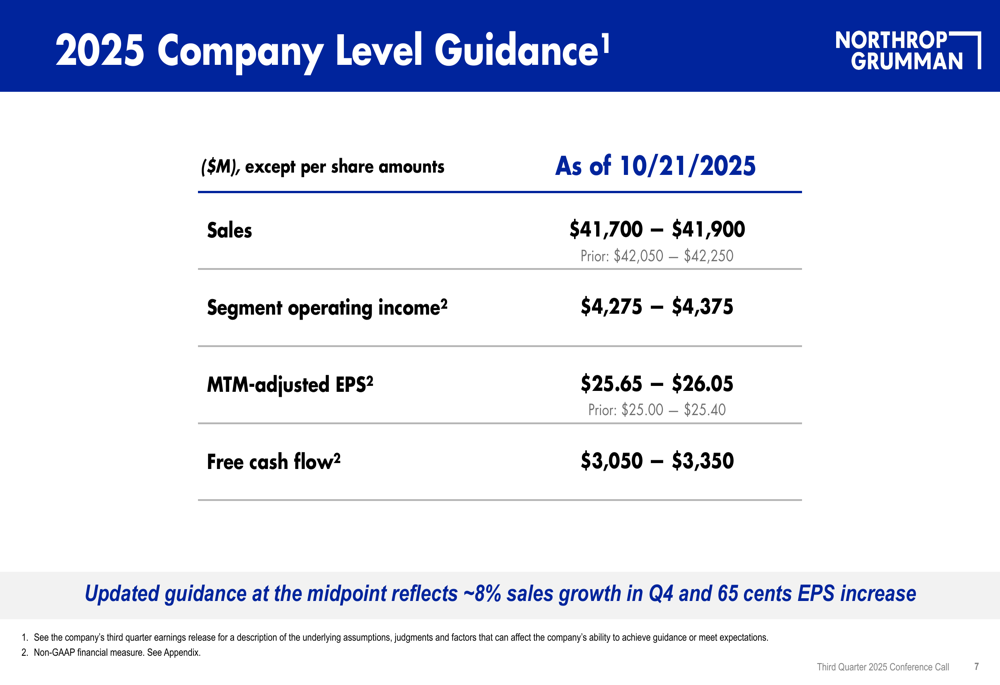 Northrop Grumman adjusted its full-year 2025 guidance, lowering its sales expectations while raising its earnings outlook. The updated company-level guidance is shown here: