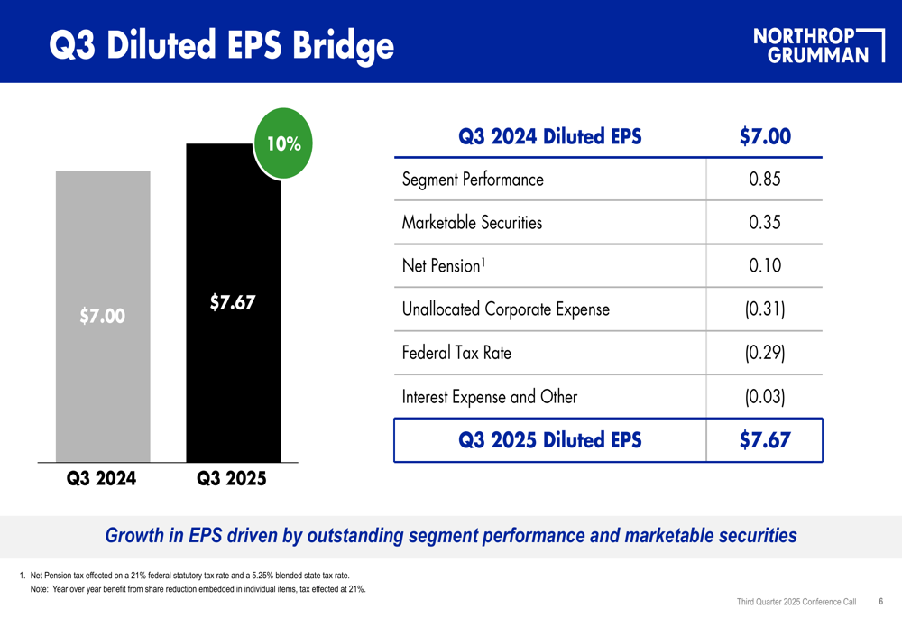 Diluted earnings per share grew from $7.00 in Q3 2024 to $7.67 in Q3 2025, a 10% increase. The company’s presentation broke down the key contributors to this EPS growth: