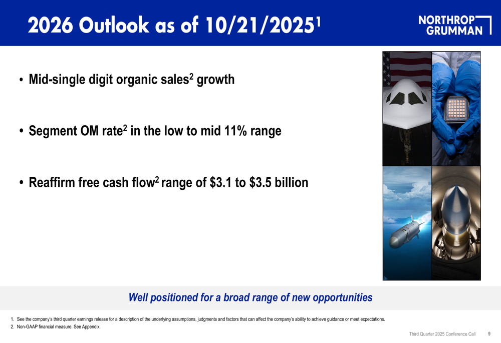 Northrop Grumman delivered organic sales growth of 5% year-over-year for Q3 2025, reaching $10.42 billion. More impressively, the company expanded its segment operating margin rate to 12.3%, up from 11.5% in the same period last year, demonstrating improved operational efficiency.