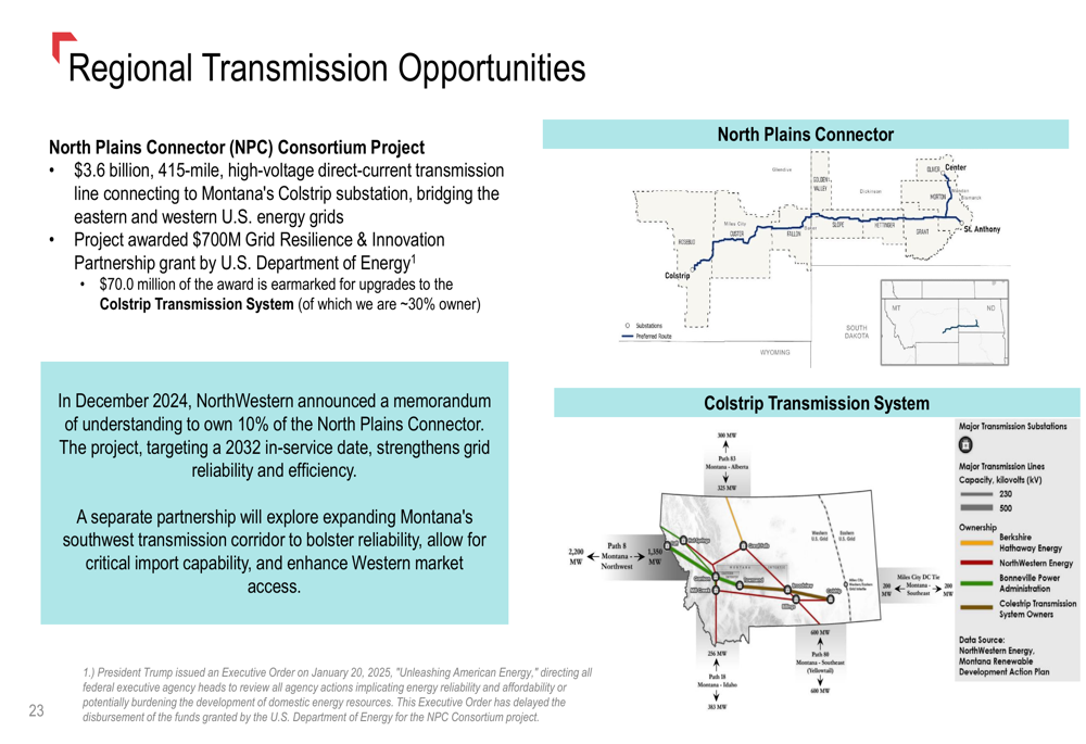 In transmission infrastructure, NorthWestern is participating in the North Plains Connector Consortium Project, a $3.6 billion, 415-mile transmission line that received a $700 million Grid Resilience and Innovation award. The company will own 10% of this project and is exploring additional expansion opportunities for Montana’s southwest transmission.