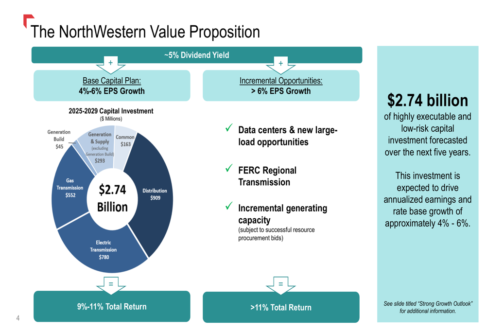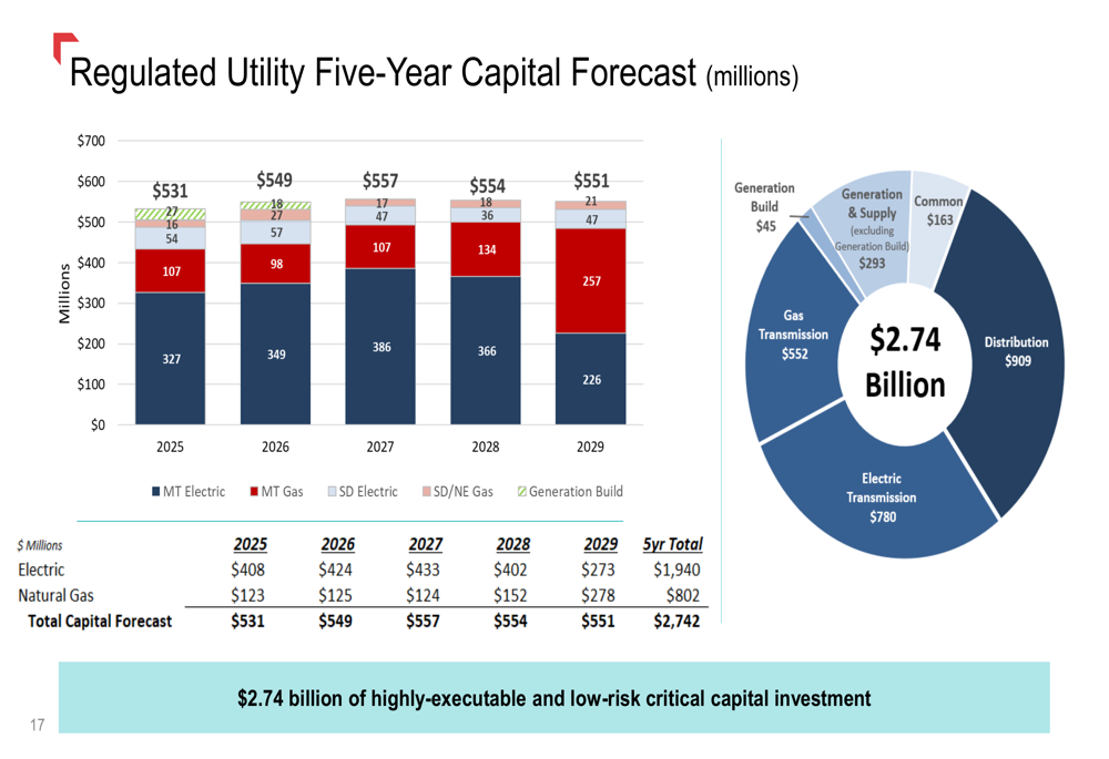 NorthWestern initiated 2025 earnings guidance in the range of $3.53 to $3.65 per diluted share and affirmed its long-term rate base and earnings per share growth rate targets of 4% to 6%. The company’s five-year capital investment plan totals $2.74 billion, allocated across various segments including distribution, electric transmission, and gas transmission.