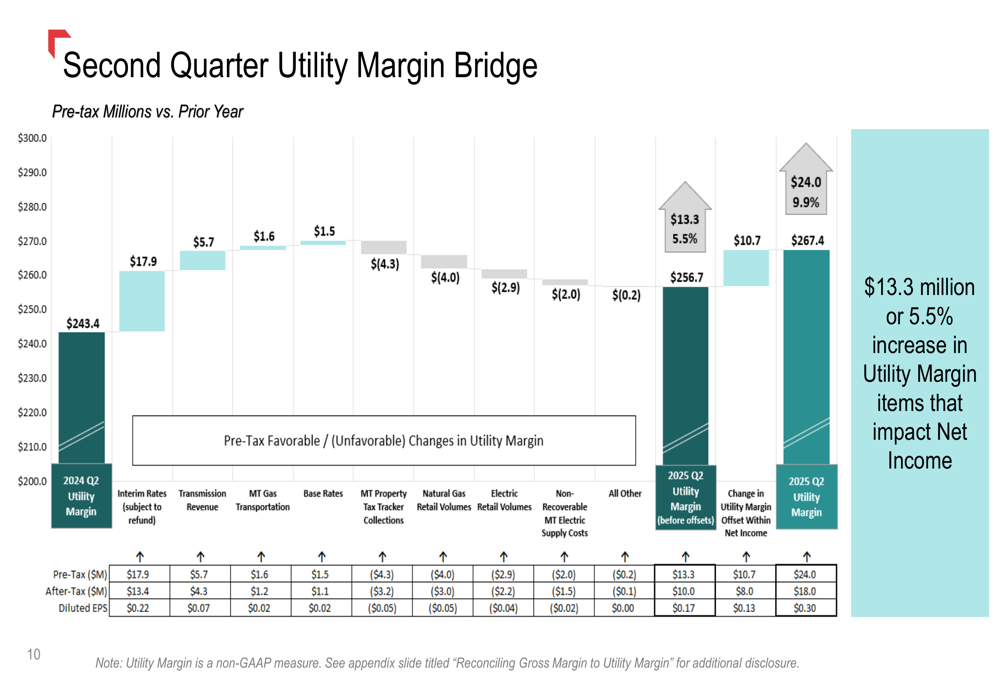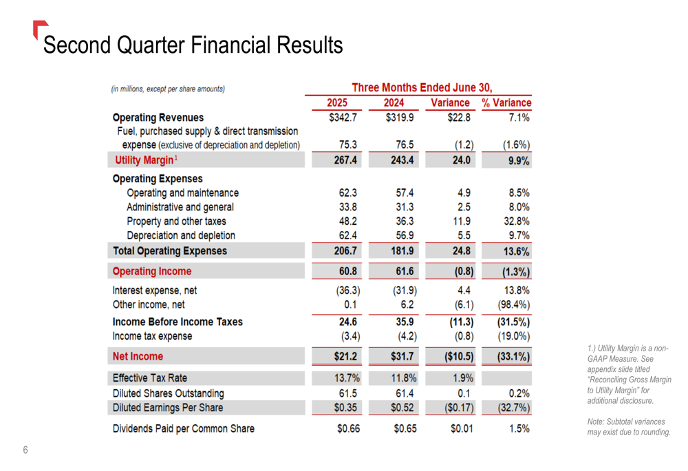 NorthWestern reported second-quarter GAAP diluted earnings per share of $0.35, a 32.7% decrease from $0.52 in the same period last year. Non-GAAP diluted EPS also declined to $0.40 from $0.53, representing a 24.5% drop. Despite these decreases, operating revenues increased by 7.1% to $342.7 million, and utility margin improved by 9.9% to $267.4 million.